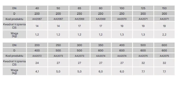 | DN | 40-50, 65-80, 100, 125-150, 200, 250-300, 350-400, 500-600 |